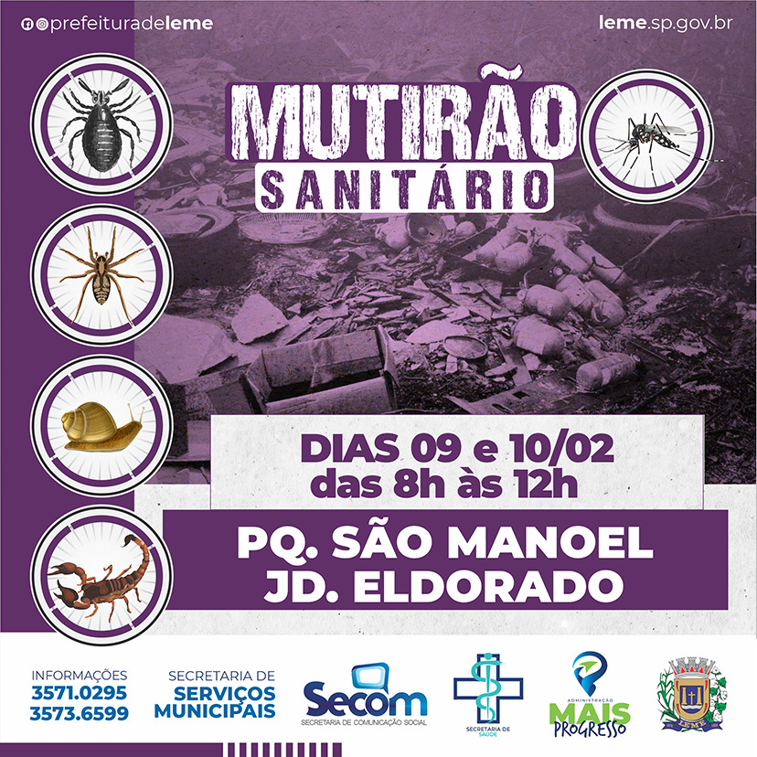 A Prefeitura do Município de Leme/SP, através da Secretaria de Saúde e Núcleo de Controle de Zoonoses, informa que realizará na quinta-feira e sexta-feira, dias 09 e 10 de fevereiro, “MUTIRÃO SANITÁRIO” de 2023.