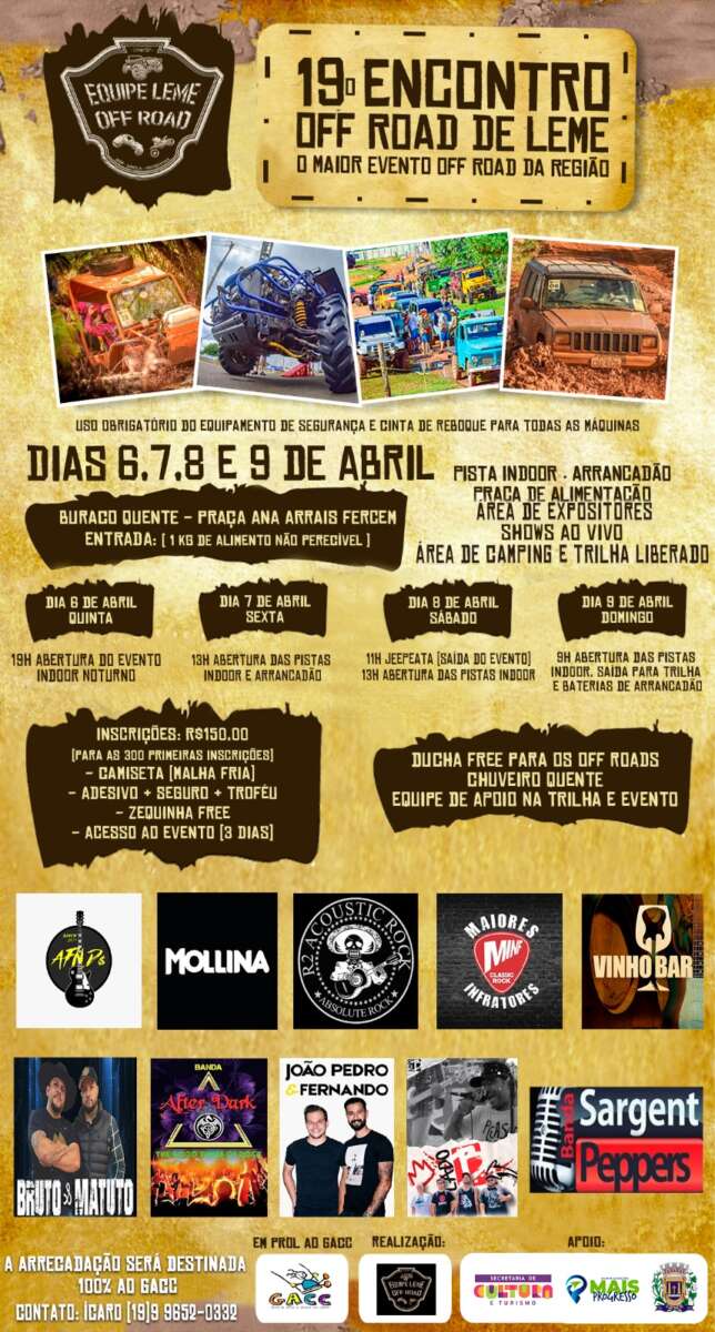 Entre os dias 6 e 9 de abril, na Praça Ana Arrais Fercem, o popular “Buraco Quente” acontecerá o 19º Encontro Off Road de Leme. Para participar em algumas atrações específicas, haverá a necessidade de fazer inscrição mediante taxa de R$150,00 que será doada para o GAAC.