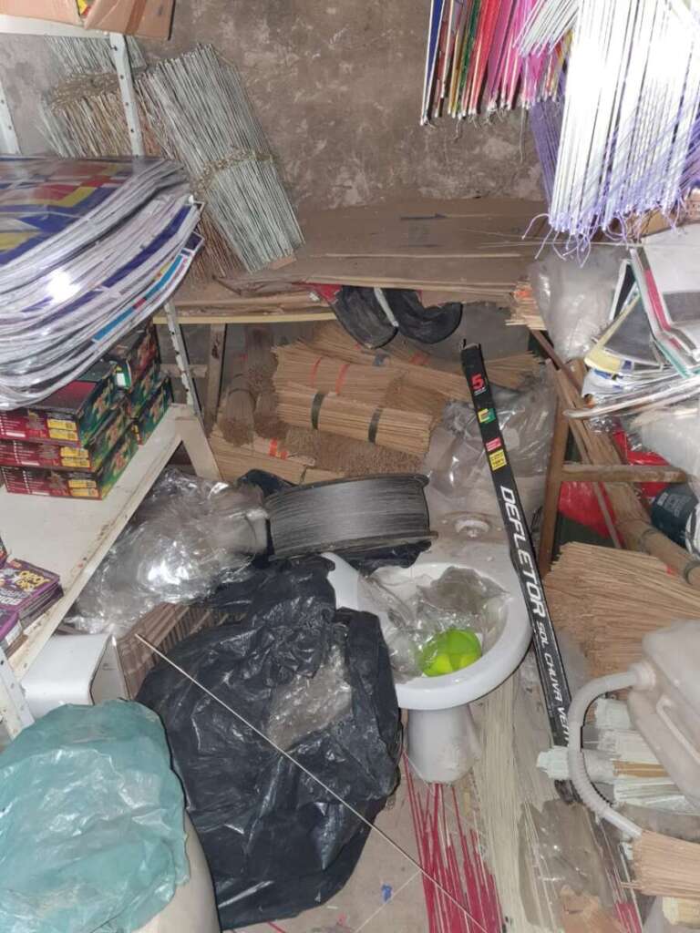 Neste local foram encontrados petrechos para produção de linha com cerol, como pó de vidro e cola, aparentando que ele produz linhas com cerol no local porque há um tipo de máquina para enrolar linha e passar a mistura de cola com pó de vidro.